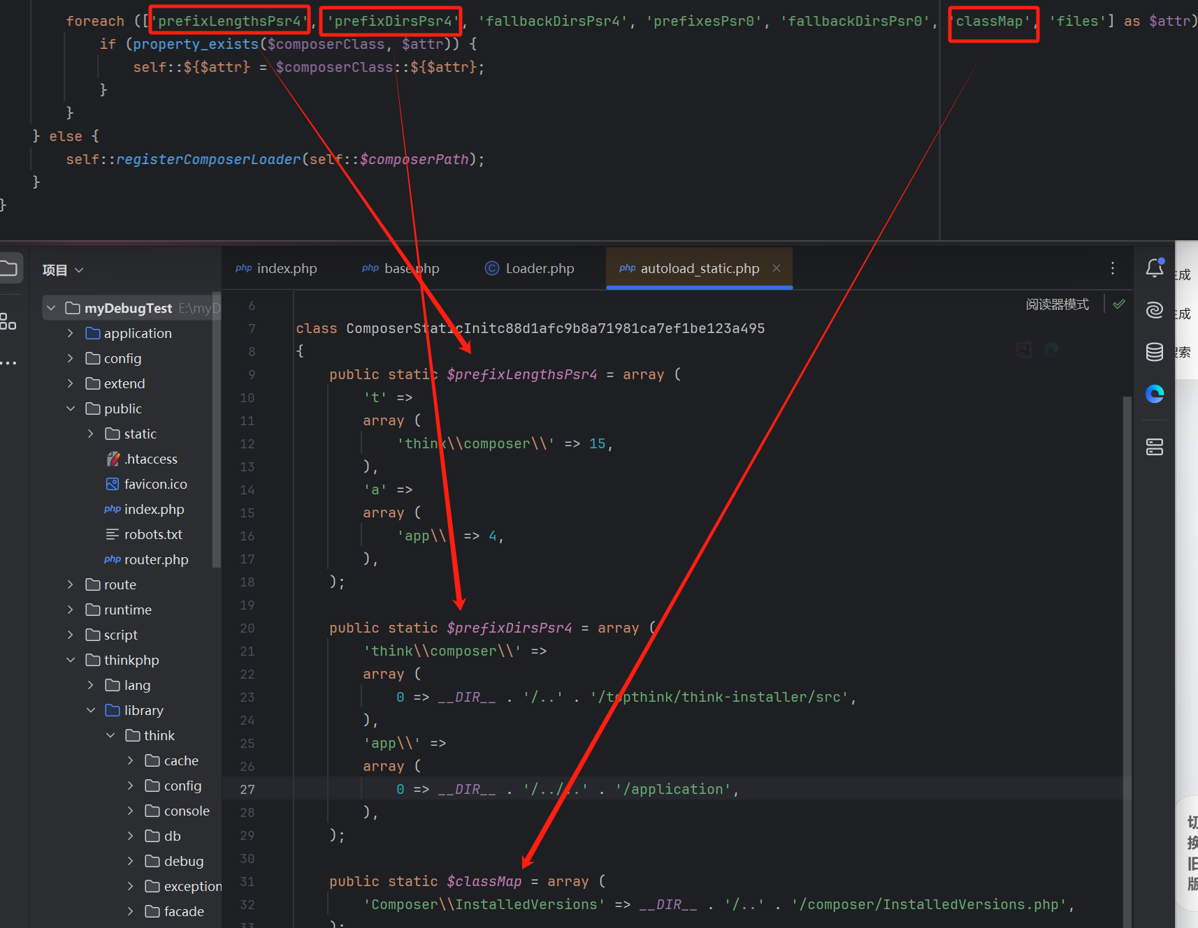 在下面还有一个函数property_exists作用是检查对象或类是否具有该属性,也就是$attr这里面定义的属性在没在$composerClass这个类里面,最后查看这个autoload_static.php文件里面仅存在三个属性,那self::${$attr} = $composerClass::${$attr};的属性结构其实就这三个属性
