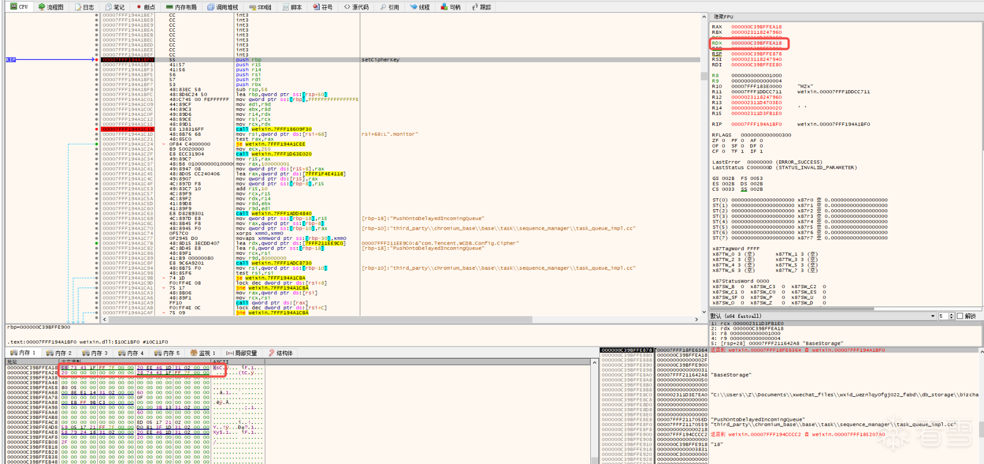 x64dbg附加到wx,先不要登录,不然不会触发setCipherKey了。在setCipherKey处下个断点,然后登录。