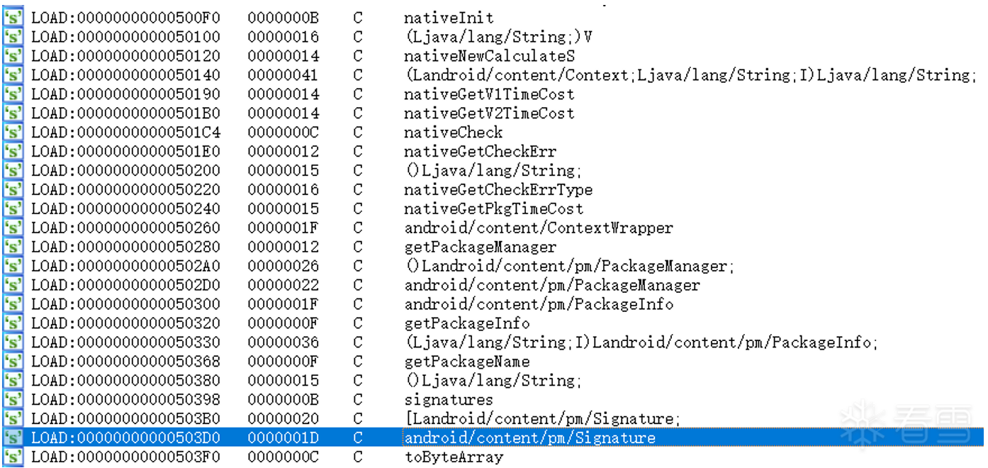字符串处也出现了 nativeInit 和nativeNewCalculateS函数名称,和PackageManager 、PackageInfo 和 Signature 的Android的签名校验的类。