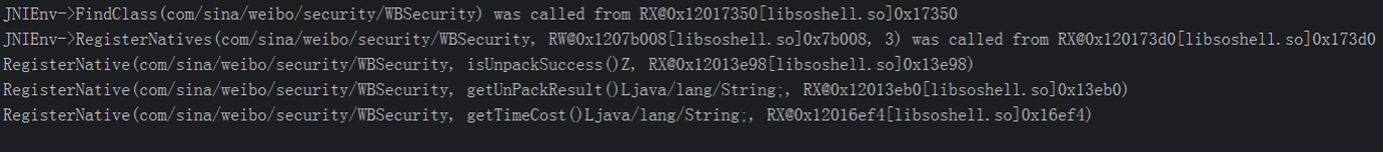 这时的运行结果为RegisterNative动态注册了WBSecurity下的三个native函数,但是SLib的函数并没有注册;调用isUnpackSuccess()和getUnPackResult()两个结果,提示原so并没有解压成功。