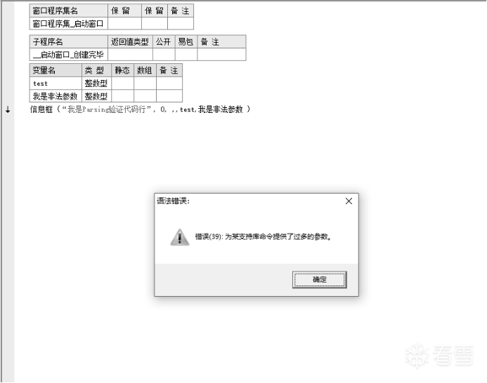 可以看到如图 3所示的情况,易语言自动添加了俩个变量,分别为“test”和“我是非法参数”。同时,我们可以发现出现了新的报错“语法错误:错误(39),为某支持库命令提供了过多的参数”。