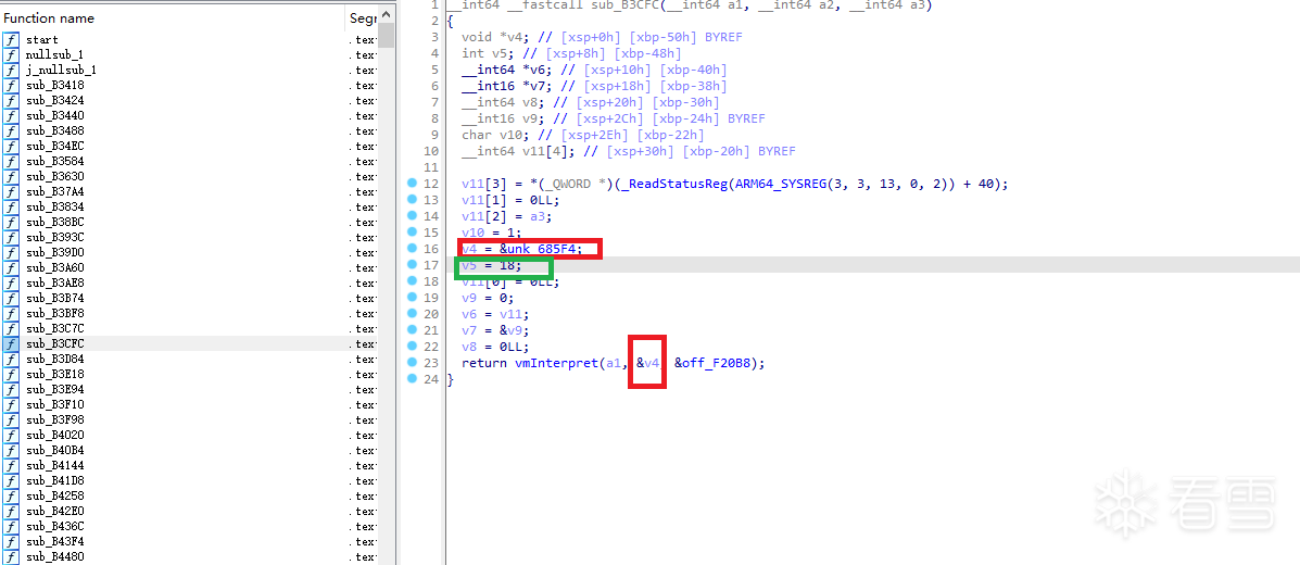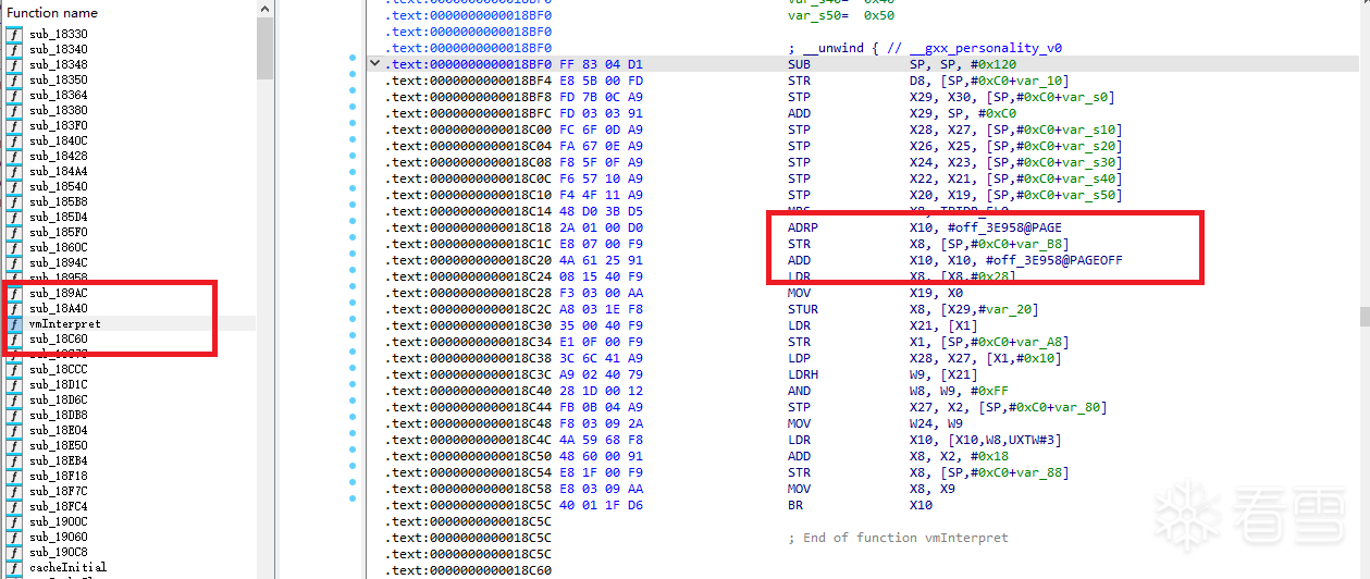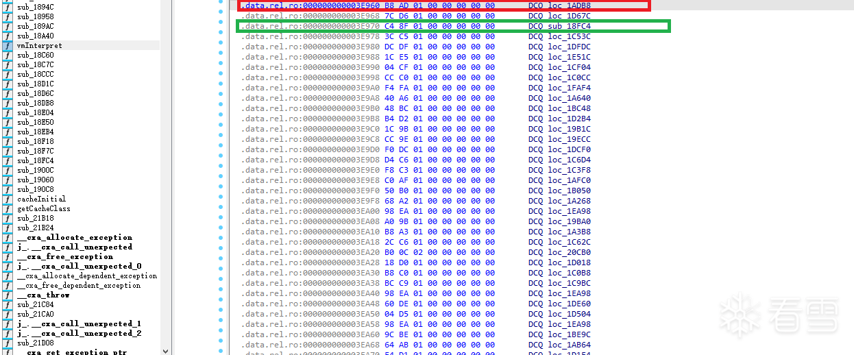 使用ida打开解释器so,找到解释函数vmInterpret,点击红框中的地址跳转