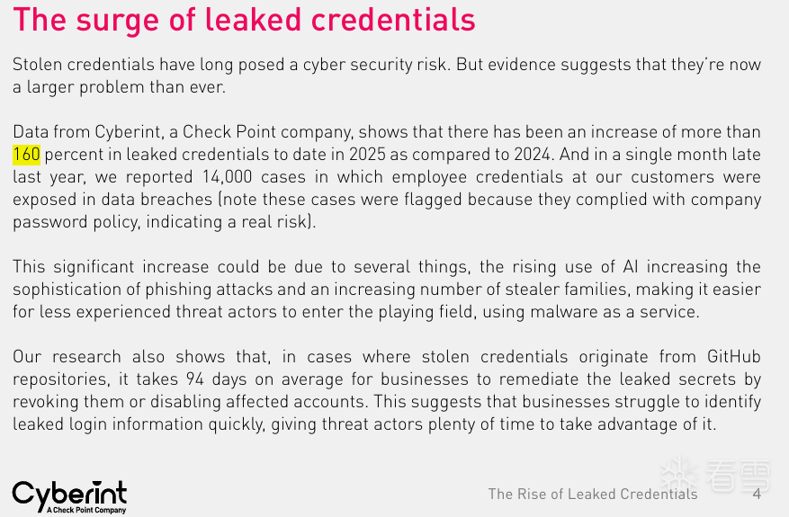 根据Cyberint(Check Point)数据:2025年泄露凭据数量同比激增超160%