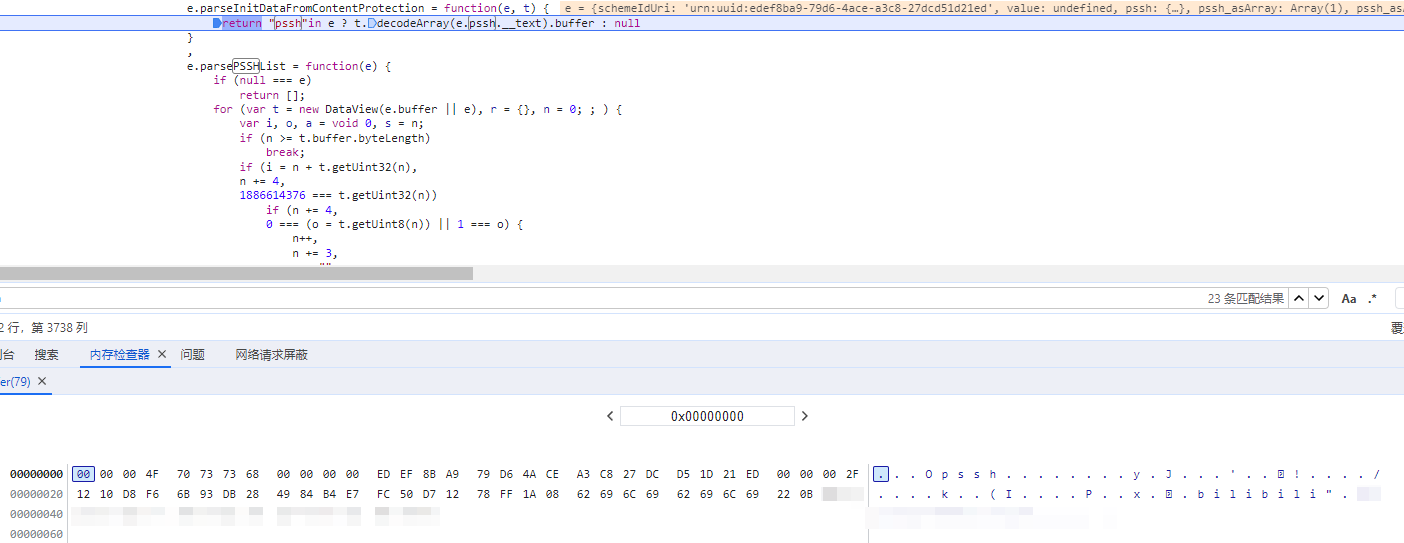 接着它就能获取到 kid (从 playurl 接口得到),注意对比两次的 playurl 请求会发现第一次请求是没有 bilidrm_uri 而只有 widevine_pssh 的,第二次则相反,因为第二次请求没有加 &drm_tech_type=2 的参数