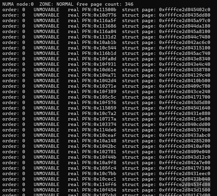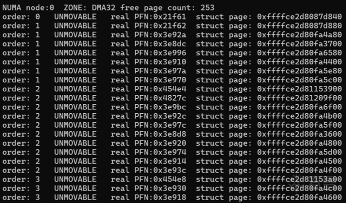 申请过程可以看到对于 128M 的物理内存页面,NORMAL的ZONE 提示页面不足,最后都是在 DMA32 ZONE 中找到的页面。