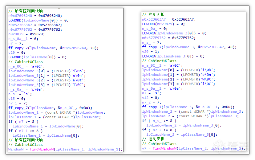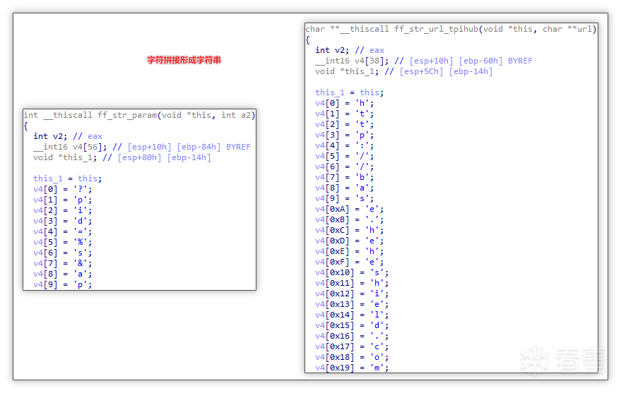 拼接字符串: 其中部分字符串通过单字符拼接的方式获取,从而规避静态字符串提取,加大逆向分析复杂度。
