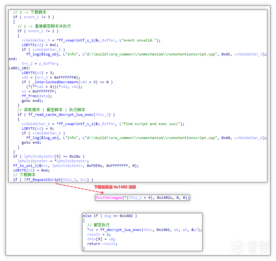 执行脚本前期准备以及创建 runext.exe 执行脚本进程: 获取到 cachestub.dll 模块发送过来的数据后,通过 event 数值进行不同的操作,若 event 值为 1 或 3 时则会准备执行脚本,而值为 2 的时候将会执行删除缓存操作。如下图所示,其中 1 或 3 时会先解析传过来的 JSON 数据后构造出新的 JSON 数据(该数据中包含 event 值与 url 值),随后将 0x1401 消息传递出去,该消息的含义是该模块中为执行脚本。