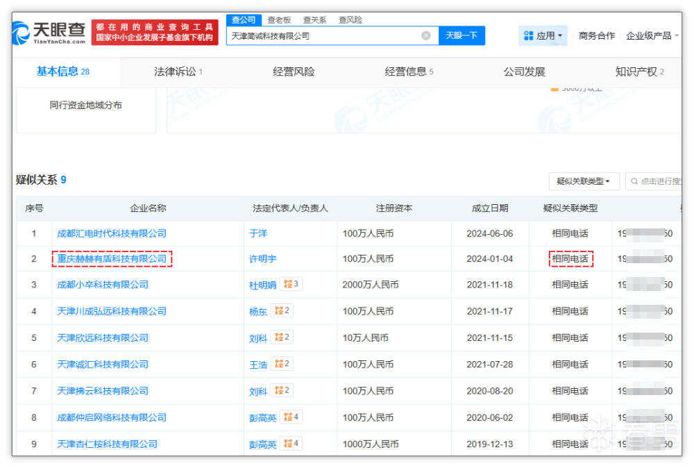 因为分析时发现 DX 强力修复软件会推广自家其他软件或其他公司的软件(例如 BlueDove 小蓝鸽签名为“天津简诚科技有限公司”),所以通过“天眼查”等查询软件发现这些公司之间有一些细微的联系,例如电话号码、姓名、邮箱后缀等地方出现意外关联。