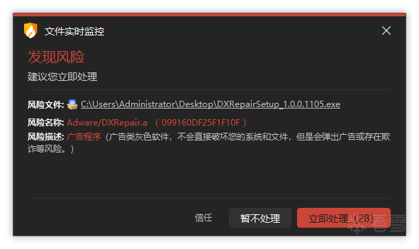 近期,火绒威胁情报中心监测到名为“小蓝鸽极速卸载”软件频繁推广至用户,通过溯源发现其源头有“多标签文件管理器”、“DX强力修复”、“EchoFind 文件搜索”等软件,软件中包含的插件极其相似,分析过程中选择了其中的一个名为“DX 强力修复”的软件进行分析,分析初期发现该软件有锁屏广告,随后发现还会进行桌面弹窗推广、任务栏图标闪烁推广、直接静默安装后展示一定时间弹窗、若错过则保持安装等行为,甚至浏览器访问特定页面时额外跳转至推广页面。其推广行为都是由下发的云控配置决定,且下发的配置中包含各种规避行为,例如规避安全软件、读取浏览器历史记录匹配特定 URL 进行规避等。火绒安全产品可对上述流氓软件进行拦截查杀。