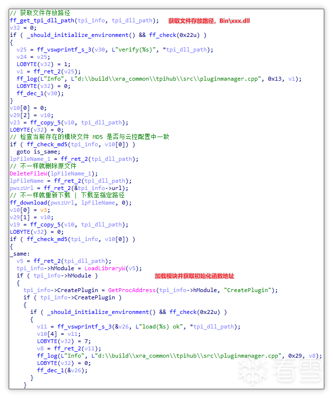 下载并加载获取其中初始化函数地址: 随后先获取文件存放路径,随后检查该路径文件的 MD5 值是否与云控配置中的 MD5 值一致,如果不一致则会删掉原文件并通过 tpi_url 下载新的弹窗推广模块并加载该模块,获取其中 CreatePlugin 初始化函数地址。