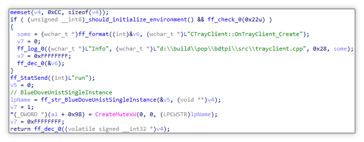 1.1.1 bdtpi.dll(弹窗推广模块—小蓝鸽) 创建互斥体: 该模块也与分发模块类似,初始化时创建互斥体 BlueDoveUnistSingleInstance,只是名称不同,且后续也会等待互斥体,防止出现冲突。