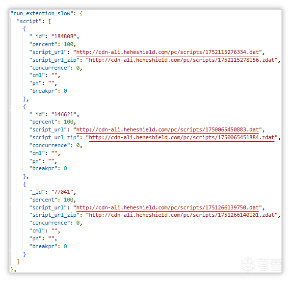云控配置来源: 与 pwnd.dll 模块一样,也是通过 cache.dll 获取云控配置并通过cachestub.dll 传输,不同的是 pwnd.dll 会利用 ppw_slow 字段值,runext.pln 会利用 run_extention_slow 字段值执行脚本,下图中 script_url 与 script_url_zip 分别为非压缩和压缩包形式的被加密 Lua 脚本。