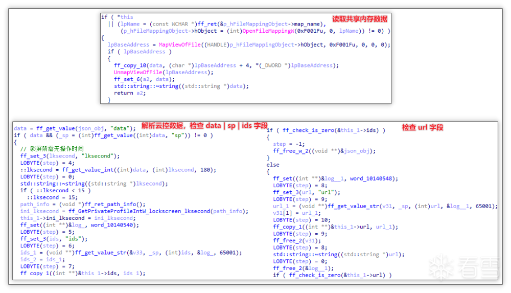 读取云控数据并检查必要字段: 随后再通过内存映射对象获取云控数据,解析并判断是否 data->sp 字段下 ids、url(锁屏推广时所打开的网页链接) 等字段数据是否存在,若存在则执行锁屏监听倒计时。这里并非只读取上述字段,也会读取其他频率相关字段并设置锁屏广告频率,只是不会影响锁屏广告的出现。例如,其中 lksecond 字段值为监听倒计时的默认秒数。