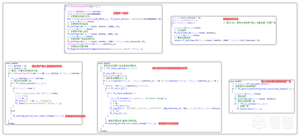 倒计时监听器设置: 设置三个 Timer 监听器,其中 0x463 与 0x464 事件可以利用用户输入与鼠标移动幅度刷新监听时间,0x465 事件可以在倒计时结束后调用锁屏广告。