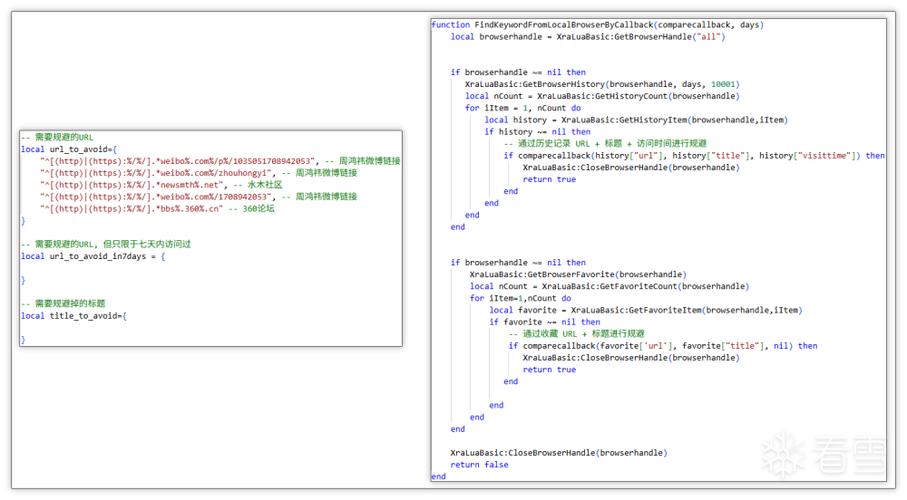 规避特定浏览器历史记录与收藏中 URL: 其中某个 Lua 脚本还会获取浏览器历史记录与收藏的网址进行规避,猜测是不想干扰特定人群,从而避免麻烦。