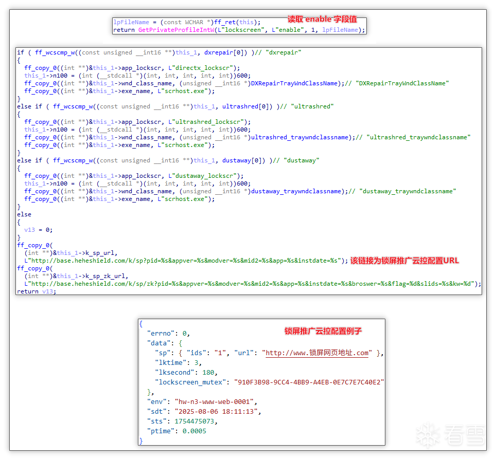 初始化: 初期会先将软件相关 URL、类名、软件名等信息存储至全局变量中,随后通过读取 AppData\Roaming\cdheheyoudun\config.ini 中读取 lockscreen 项下 enable 字段,如果为 1,则会继续执行。随后会请求至 base.heheshield.com/k/sp 获取锁屏相关云控配置。