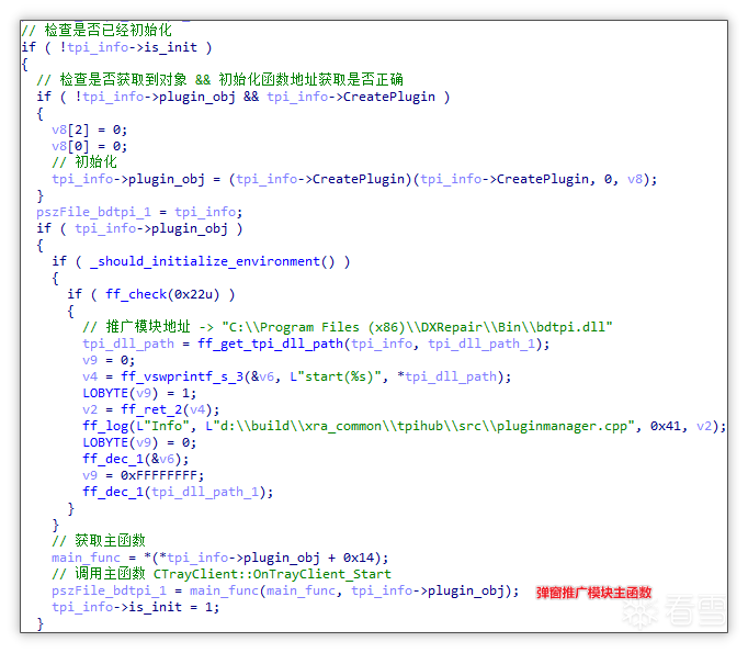 一、样本分析 启动插件: “DX 强力修复”软件主进程为 dxrepair.exe,启动初期不仅初始化自身相关,创建软件窗口,还会加载并初始化推广插件或插件必要模块,随后分别执行插件主函数。