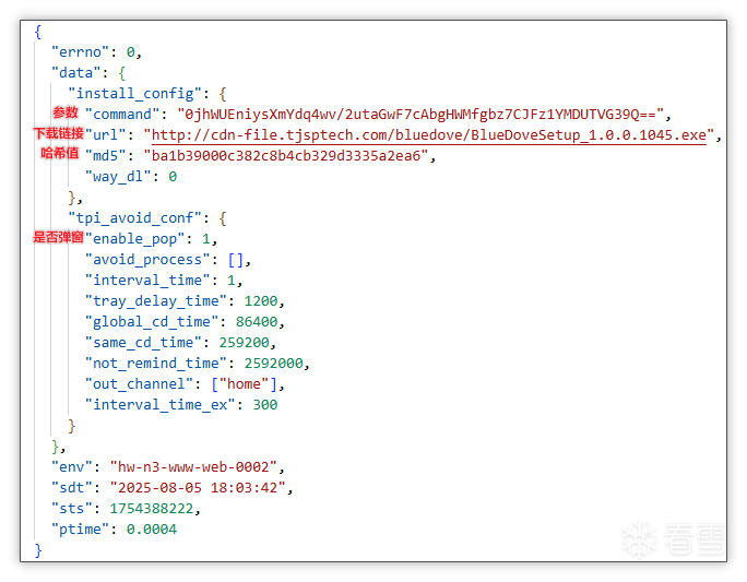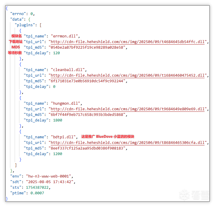 解析弹窗推广云控配置: 获取到的云控配置中含有多个推广模块,本文以 bdtpi.dll(小蓝鸽弹窗推广模块)为示例进行分析,可以看到其中含有模块本地名、模块下载地址、模块哈希值、模块等待秒数,随后该模块对云控配置进行解析并准备下载。