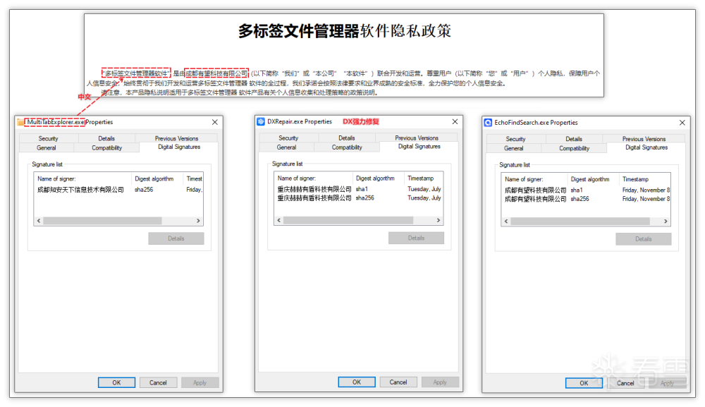 二、溯源分析 初期关注到该事件是因为火绒威胁情报系统中小蓝鸽数据异常,从而判断可能是有其他软件正在推广该软件,其中通过数据发现主要是来源于“多标签文件管理器”、“DX强力修复”、“Echofind”等多种软件,通过数字签名和隐私声明中发现这些软件是由“成都有望科技有限公司”和“重庆赫赫有盾科技有限公司”等制作。