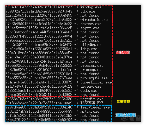 检测进程: 将会进行检测的进程有三种,分别为必须规避、系统管理进程、远程控制进程,对应的处理方式也会不同。