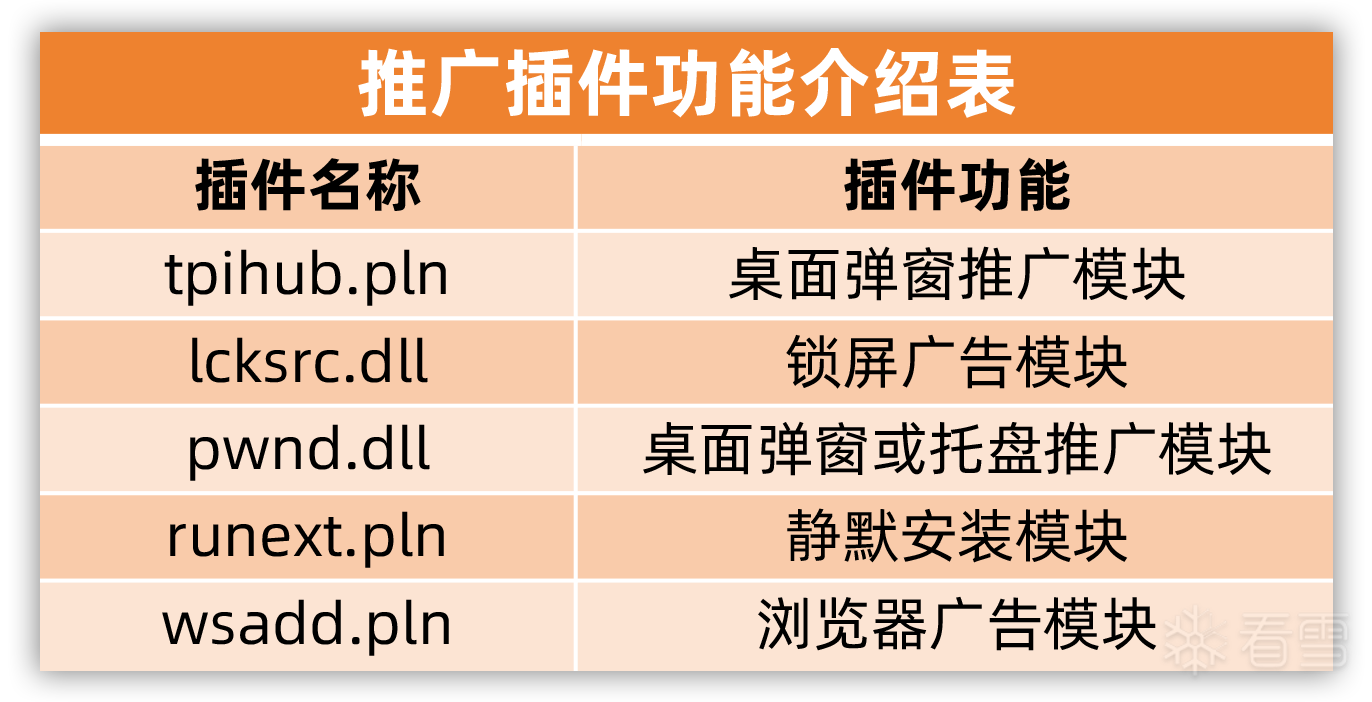 多个推广插件: 插件是以独立文件的形式存储在安装目录下的 Bin 或 Plugins 文件夹下,其中推广相关插件分别有弹窗推广、锁屏推广、任务栏托盘推广、静默下载安装推广、浏览器广告等模块。其他插件例如 cache.dll 和 cachestub.dll 主要是用于云控配置的下载和分发至插件。