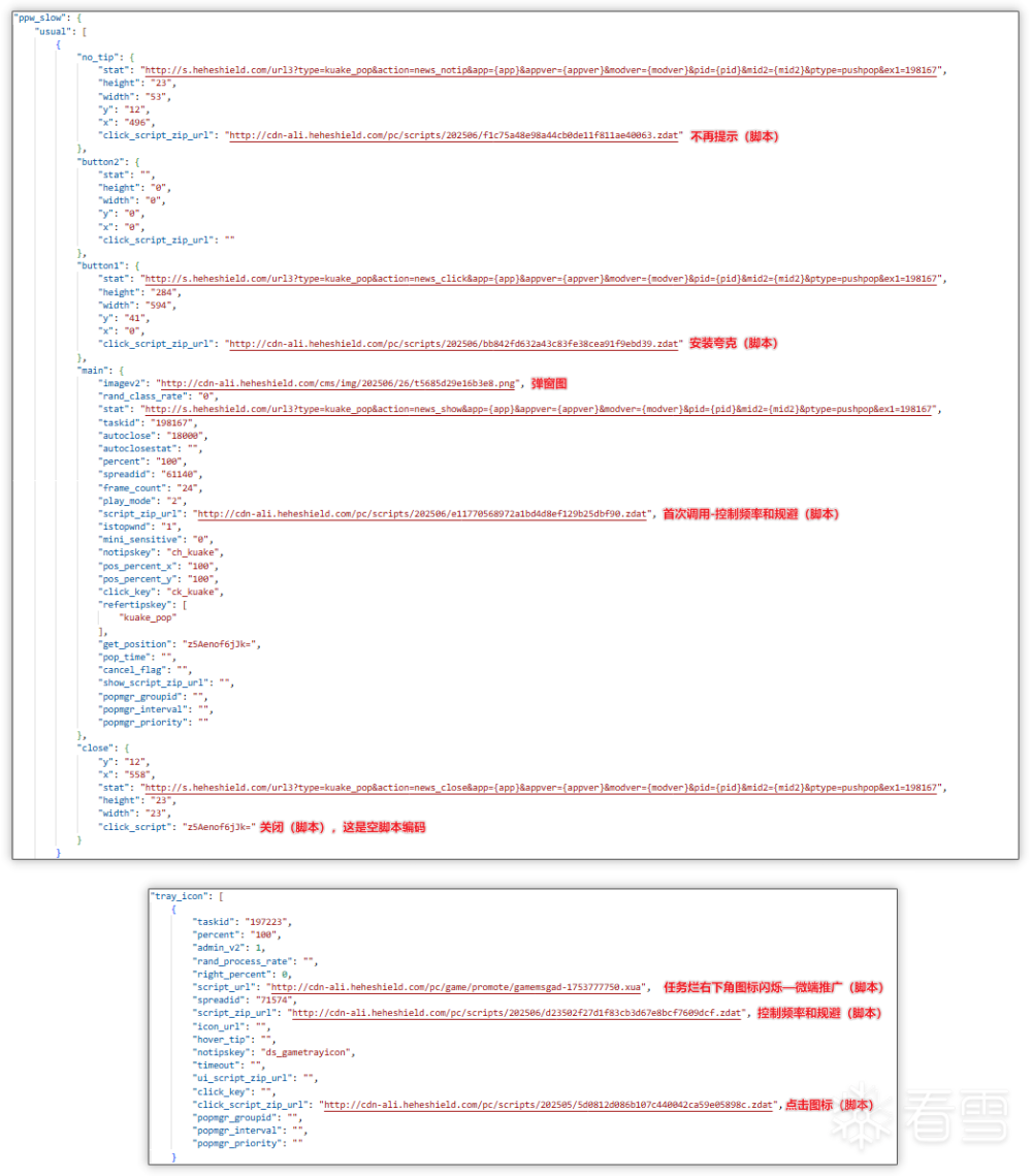 1.3 pwnd.dll(桌面弹窗以及托盘闪烁推广模块) 大致流程: 获取 cachestub.dll 分发的云控配置中 ppw_slow 字段值,其中 usual 字段值用于弹窗推广,tray_icon 用于托盘推广(主要为传奇微端推广),随后pwnd.dll会下载并执行两个字段值中不同的脚本,例如控制频率和规避脚本以及安装脚本,从而实现弹窗与托盘闪烁,其中点击托盘会打开网页,并根据云控配置判断是否下载传奇微端并执行。