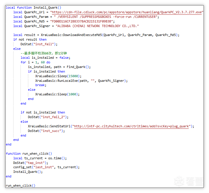 安装脚本: 点击安装按钮后开始下载,随后静默安装并检查是否安装完成,安装完成后打开夸克。