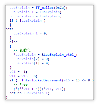 Lua 脚本执行: 随后开始执行 Lua 脚本,其中 Lua 脚本执行是通过调用 bapi.dll 导出函数 GetBasicObj,随即获取到 Lua 解释器对象,并利用对象中解释器函数进行解释执行。