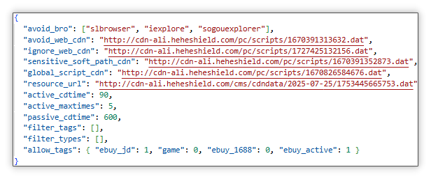 云控配置来源和作用: 与 pwnd.dll 模块一样,不同的是 wsadd.pln 会利用 alice_assist_v3_slow 字段值。其中 avoid_bro、avoid_web_cdn、sensitive_soft_path_cdn 分别规避特定浏览器、访问特定网址、特定软件;global_script_cdn 为动态开关(一般为 Lua 脚本 return "1");resource_url 为匹配特定网页并弹出推广网页所用。