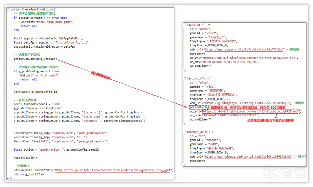 选择需推广的游戏,创建托盘并闪烁: 随后通过概率选择推广的游戏,下图代码示例为 100%概率推广“wjcq”游戏,这是因为该表中的其他游戏 percent 值都为 0,所以 10 概率则为 100%推广,随后创建托盘并闪烁。