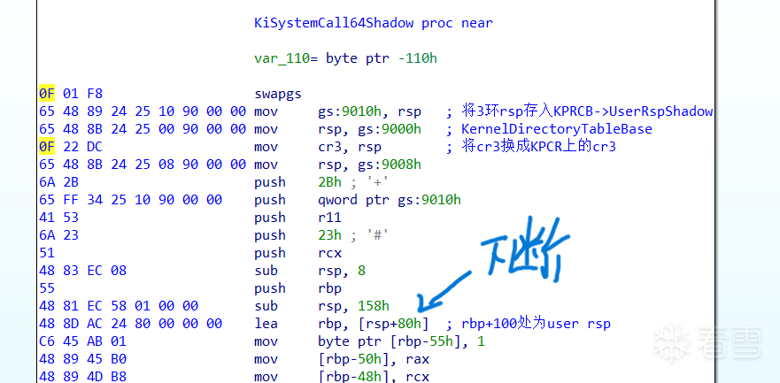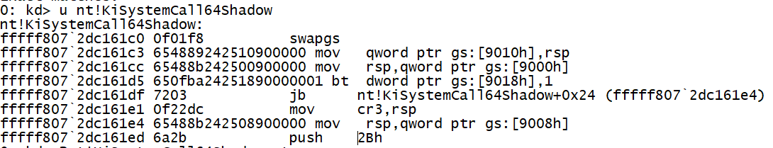 我们可以发现IA32_LSTAR寄存器的值存储的是一个叫做nt!kiSystemCall64Shadow的函数,这个函数未导出,并且由于未知原因,ntoskrnl载入时并不会完全不变,使用这个偏移在静态文件中找到对应函数是不可能的。但是,我们可以使用特征码搜索(u命令反编译或者dq,然后在ida中搜索bytes)找到这个函数。直接在这个函数开头下断点并调试是不可能的,会导致蓝屏,然而在其偏移0x3c处下断就能正常停止(非常玄学,我也不知道为什么)。