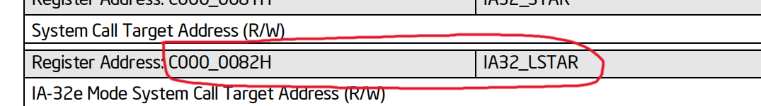 也就是说这个指令通过IA32_LSTAR这个msr寄存器来选择进入0环的地址。在白皮书介绍msr的章节则可以查找到这个寄存器的编号