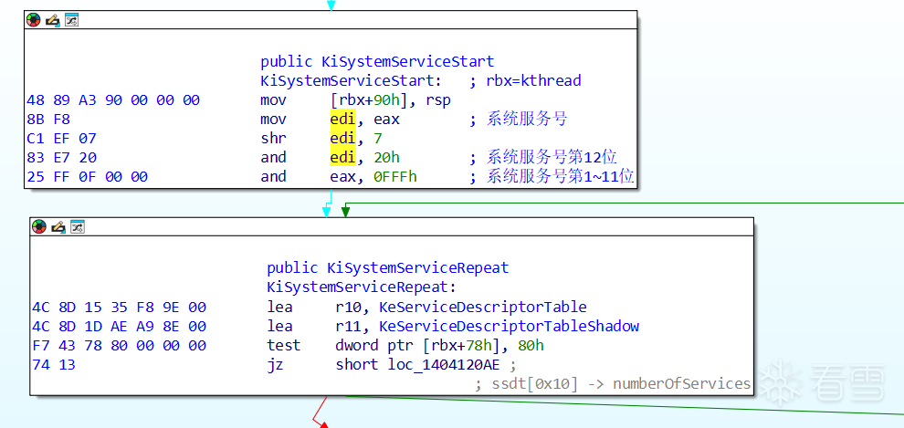 KiSystemCall64Shadow开始运行,我们最终会来到一个叫做KiSystemServiceStart的地方,下面紧跟着KiSystemServiceRepeat(这里的名字是我手动编辑的,实际上ida不会自动识别,只能自己用特征码找出来然后命名)
