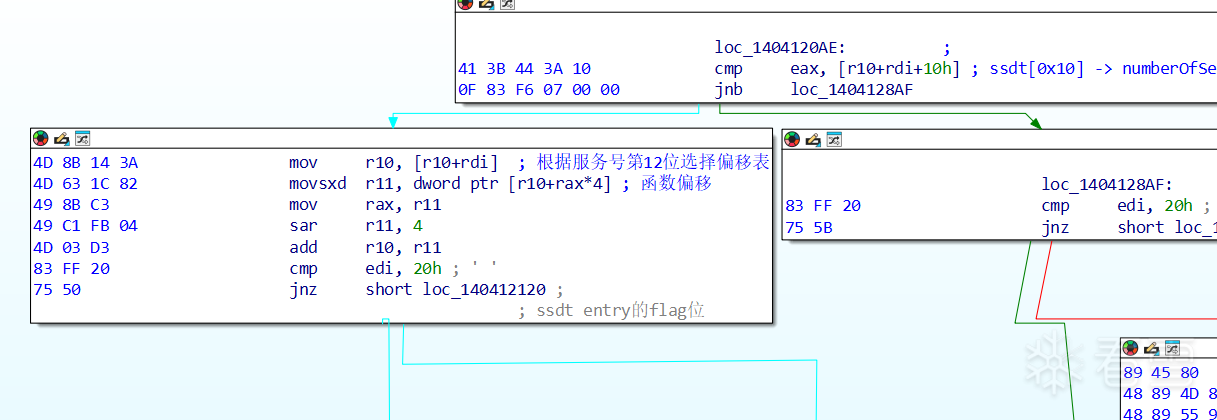 之后会来到上图左边的分支中根据系统调用号(存储在eax中)确定所要调用的函数,不过ServiceTableBase中存储的实际上并不是系统函数,而是系统函数相对TableBase的最大不超过DWORD大小的偏移量,我们看它对取到的值的运算就能看出来