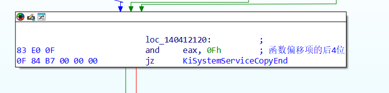 不同于xp32位中使用单独的一张表来确定每个系统调用的参数,win10 64位使用了tableBase的最后4位来确定参数个数。上面的分支中有一个jnz跳转,是用来区分普通的系统调用与win32k.sys的系统调用(edi为调用号12位),这里我们讨论的是普通的系统调用,因此这个跳转最终会执行,我们来到这个地方