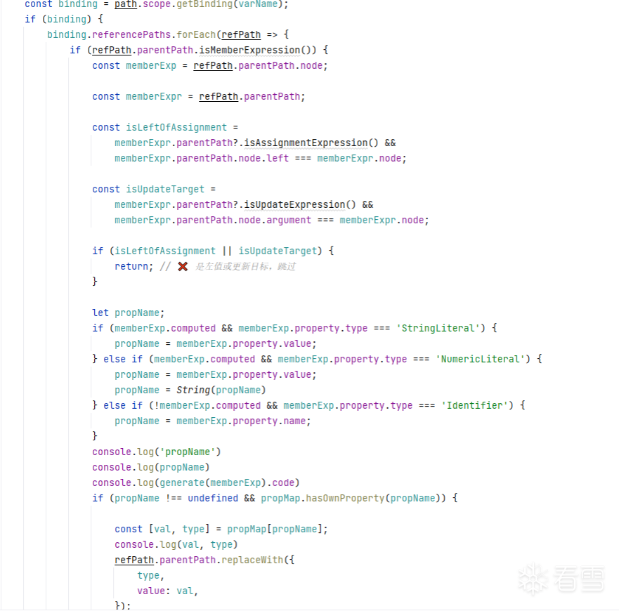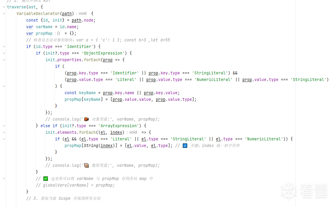 ast逻辑是,我们寻找定义这种类型的数组或者对象,取出里面的属性值构建成我们自己的隐射表,然后对后面进行引用的部分进行替换.代码大致是下面这样