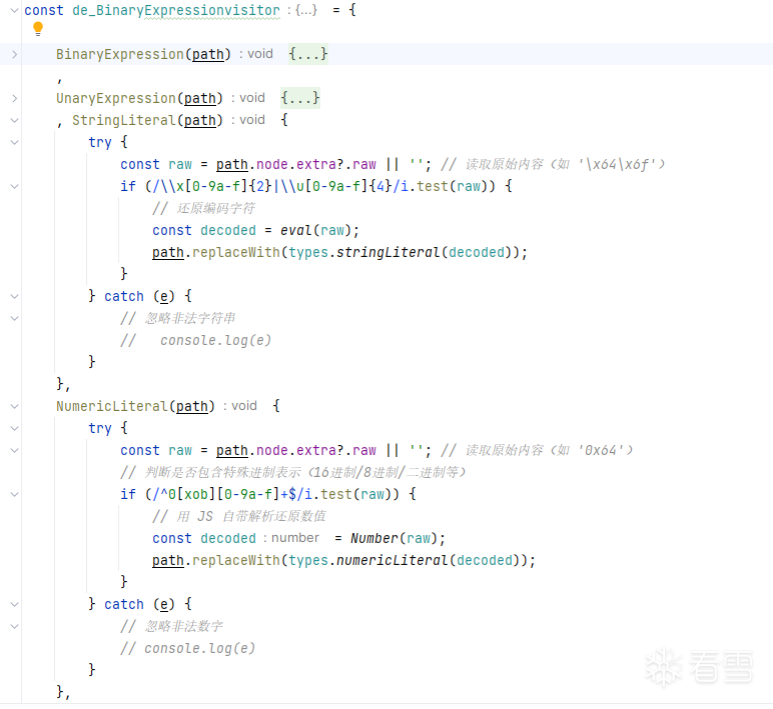 观察到这些函数都是简单的对参数进行一个二元运算然后返回结果,那么思路就是,通过ast获得return的部分,然后直接对引用的地方进行结果替换.比如jj['aCDYX']整个替换成 x<y 或者jj.pRDRy(s,e)替换成 s-e