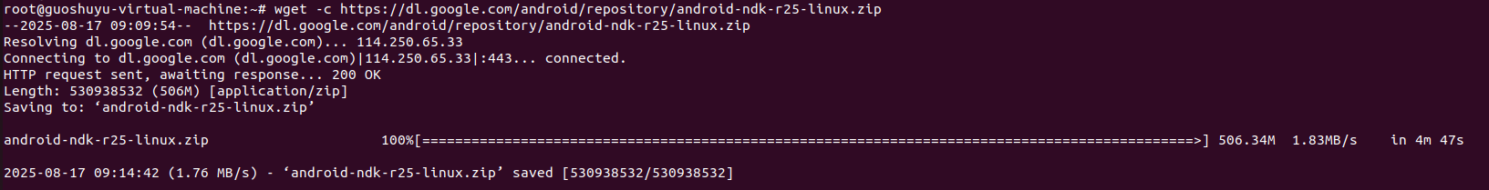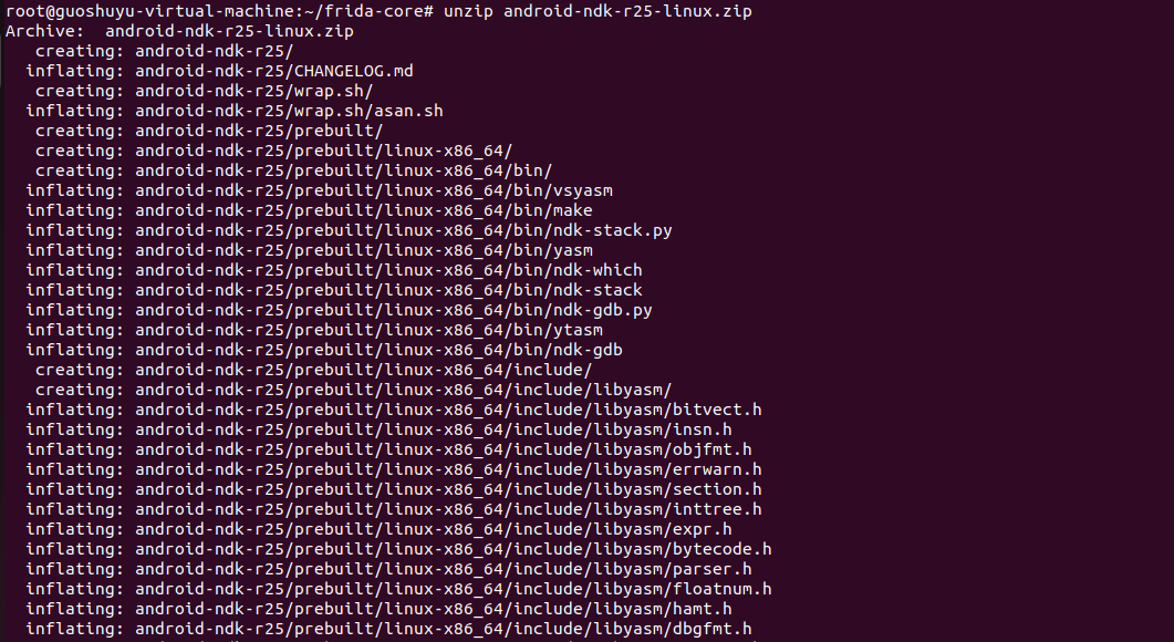 执行命令:unzip android-ndk-r25-linux.zip 将下载的zip文件解压