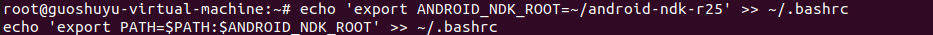 1 2 | echo 'export ANDROID_NDK_ROOT=~/android-ndk-r25' >> ~/.bashrc