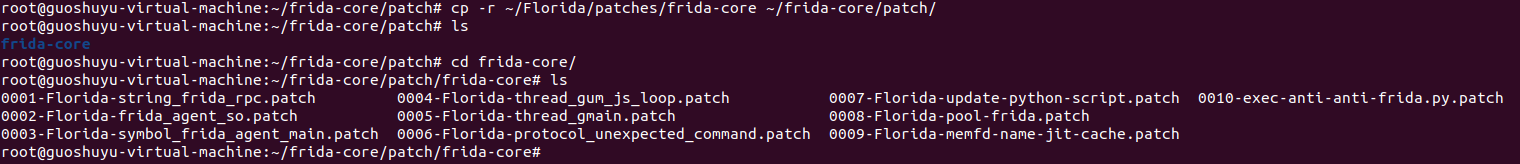 执行命令:cp -r ~/Florida/patches/frida-core ~/frida-core/patch/ 将~/Florida/patches目录下的frida-core目录复制到~/frida-core/patch中