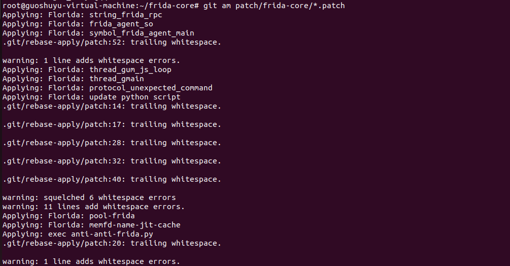 在~/frida-core目录下执行命令:git am patch/frida-core/*.patch