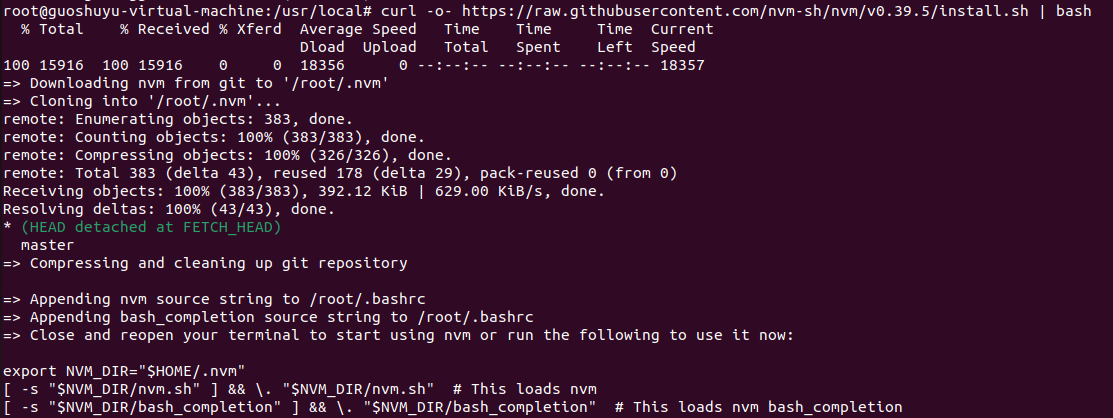 执行命令:source ~/.bashrc 使nvm安装脚本写入~/.bashrc文件的配置生效
