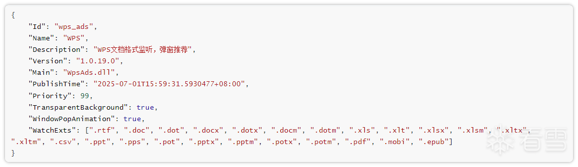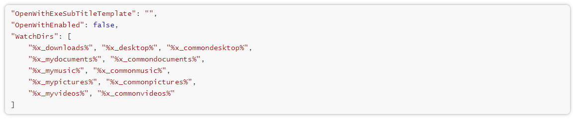 • WatchDirs:该字段指定需要监控的文件夹路径列表。监控范围涵盖常用个人和公共目录,例如下载、桌面、文档、音乐、图片、视频等。当监控程序在这些目录中检测到新文件时,会触发推荐或广告推广行为。