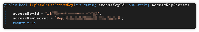该程序还会从云端下载并安装插件。分析发现,程序存在严重安全隐患:它将阿里云 OSS 和腾讯云 OSS 的 accessKeyId 与 accessKeySecret 明文硬编码在自身代码中。一旦攻击者获取这两个密钥,即可直接登录并访问对应的云存储桶,可能引发进一步的网站攻击。