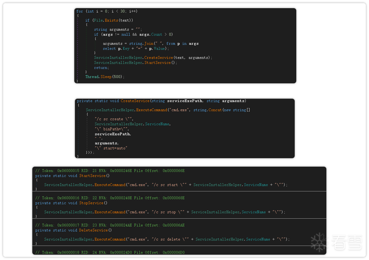 之后创建安装服务:先将 Base64 编码的服务文件解码并释放到本地,再通过 CMD 命令行创建并执行该服务。