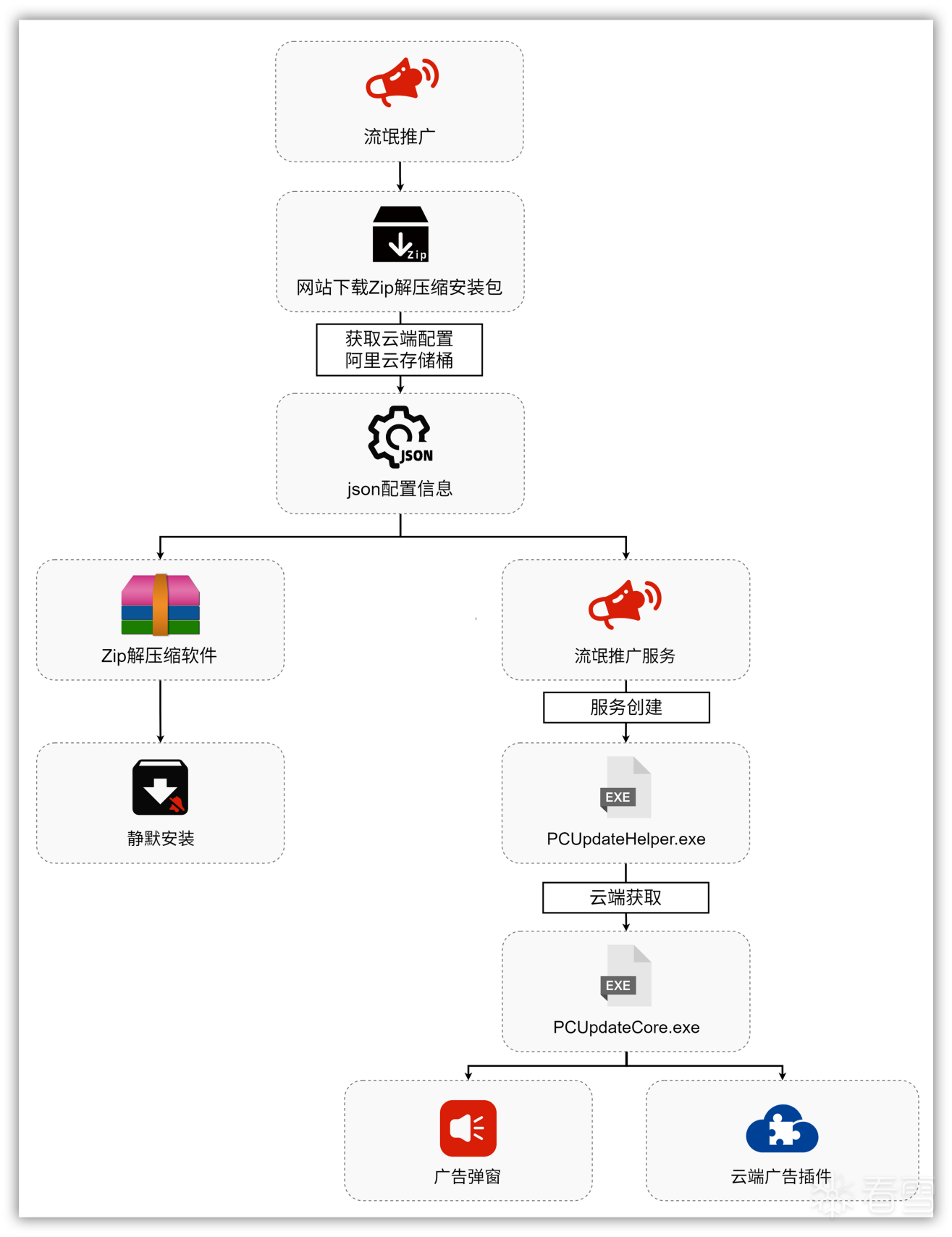 近日,火绒安全团队收到多位用户反馈,称在安装某些工具类软件时遭遇广告弹窗及其他流氓行为,严重影响使用体验。鉴于此前已有类似反馈,火绒工程师高度重视,对捕获的样本进行了重点分析。分析发现,该样本主要通过捆绑在 Zip 解压缩、PDF 转换器及录屏软件等常用工具的安装包中进行传播。一旦运行,它会从云端拉取文件并创建服务以实现持久化驻留。随后,该样本会持续获取云端配置,执行包括静默推广安装金山毒霸、WPS、CAD看图王等软件在内的一系列流氓行为,并最终伪装成插件进行集成和大规模传播。