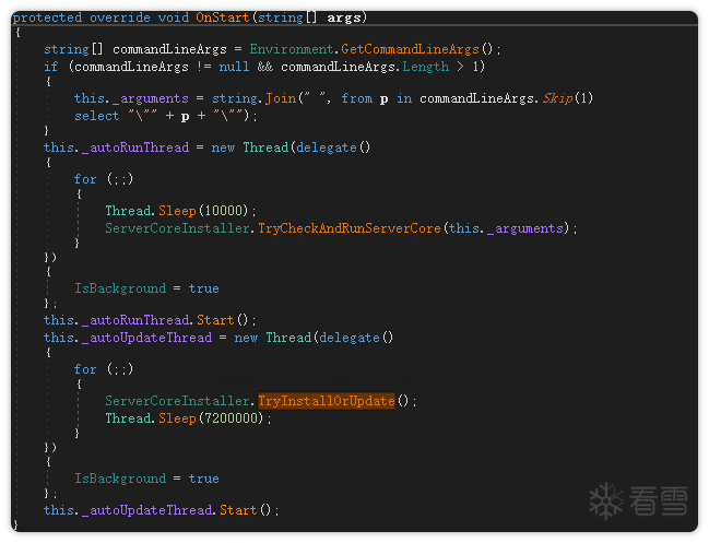随后,程序通过启动 PCUpdateHelper.exe 来加载并运行服务核心程序。该服务启动后,其 OnStart 函数会被自动调用执行。