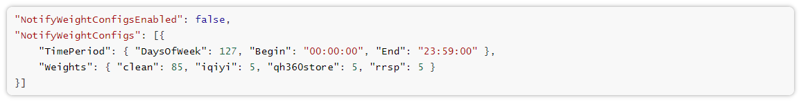 • 由于 NotifyWeightConfigsEnabled 设置为 false,当前该权重配置方案未启用,实际分发不遵循此比例。