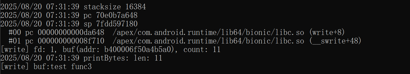 第一个是期望的结果,是stackplz生成的,下面那个是实际结果,检查过sp,pc的值也是对的,这里两个例子不是同一处函数调用
